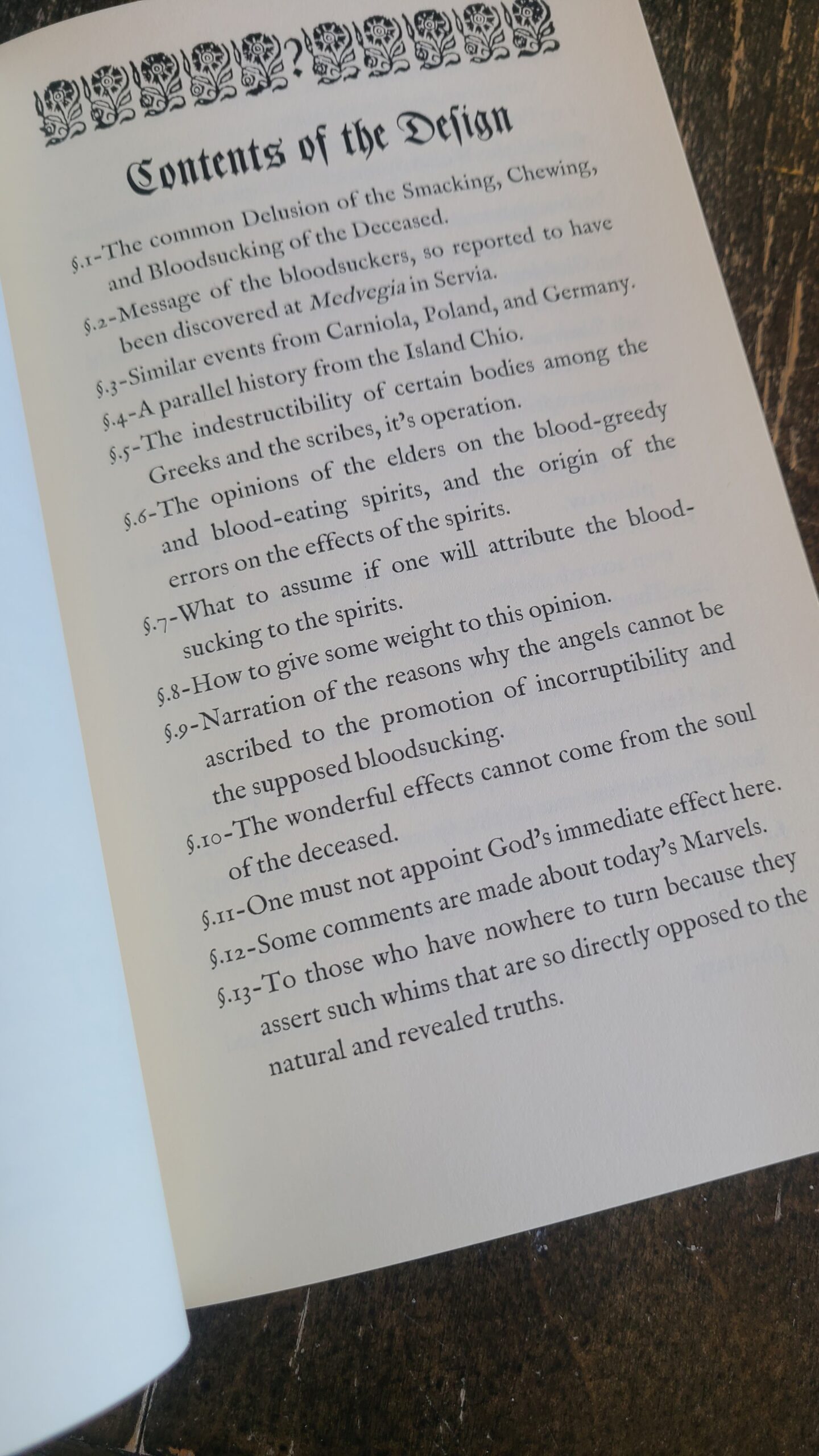 The Introduction and appendices provide historical context relating to the theological perspective behind various cases of plague and sudden death blamed on phenomenon associated with vampirism, provide biographical information on the individuals and nobility involved with the writings of this volume, analyze the philosophies and perspectives of these individuals, and further details a modern forensic analysis of certain phenomena reported on cadavers that were typically taken for a supernatural occurrence.