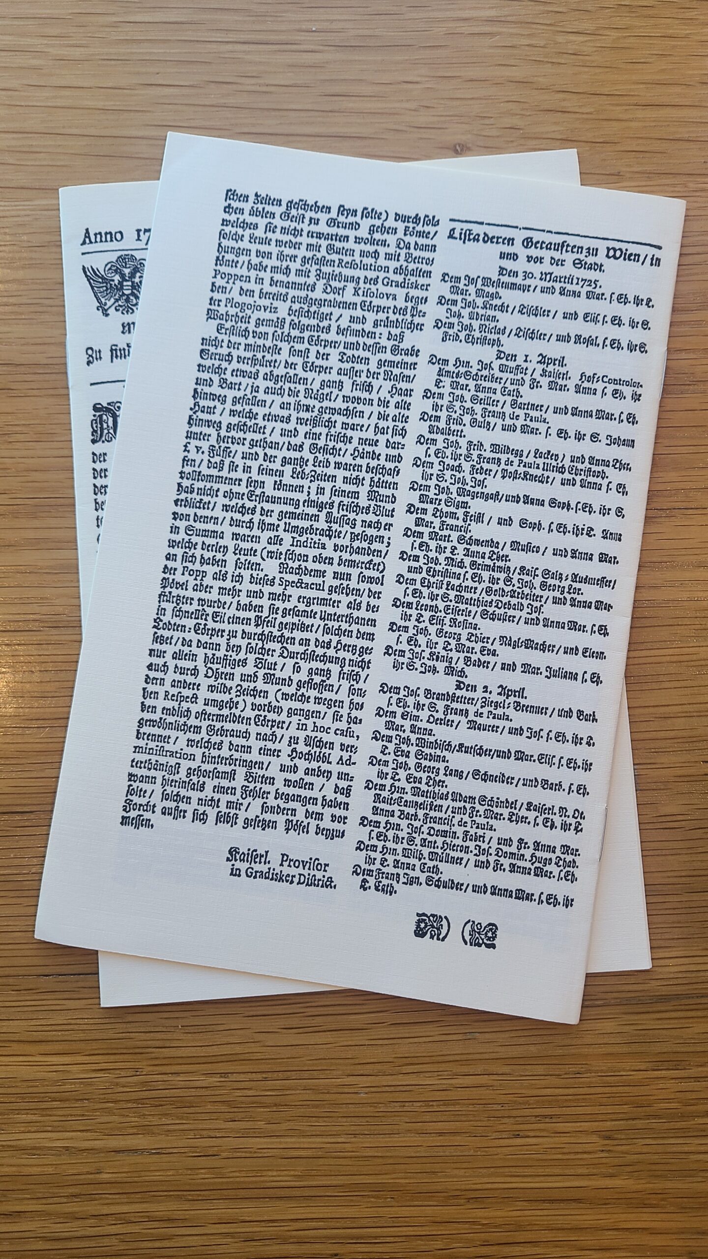 In 1725, the sudden deaths of 9 persons in a rural Serbian village caused a mob of villagers to believe the culprit responsible was the specter of a vampire buried among the graves. They exhumed the body of Peter Plogojowitz who died 10 weeks prior and demanded an Imperial Cameral Provisor named Ernst Frombald to conduct a visitation of the body and allow for the body’s execution and destruction. Frombald detailed the circumstances of these events and the findings observed from his visitation in a report that was sent to the Imperial Administration of the region in Vienna. Being subsequently printed in the 58th issue of a periodical entitled Wienerisches Diarium on 21 July, 1725, the news of this event caused an academic controversy of the day to determine the true nature of the phenomena discovered upon a seemingly incorruptible long-dead body without the typical signs of natural bodily decay in the midst of mass death. 300 years later, this issue is reproduced for the modern lover of obscure events in history that helped establish the fundamental principles of natural philosophy and the methods for scientific discovery in death scenes.